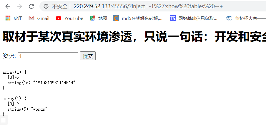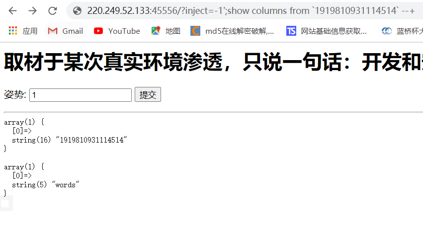 因为可以堆叠查询,这时候就想到了一个改名的方法,把words随便改成words1,然后把1919810931114514改成words,再把列名flag改成id,结合上面的1' or 1=1#爆出表所有内容就可以查flag啦