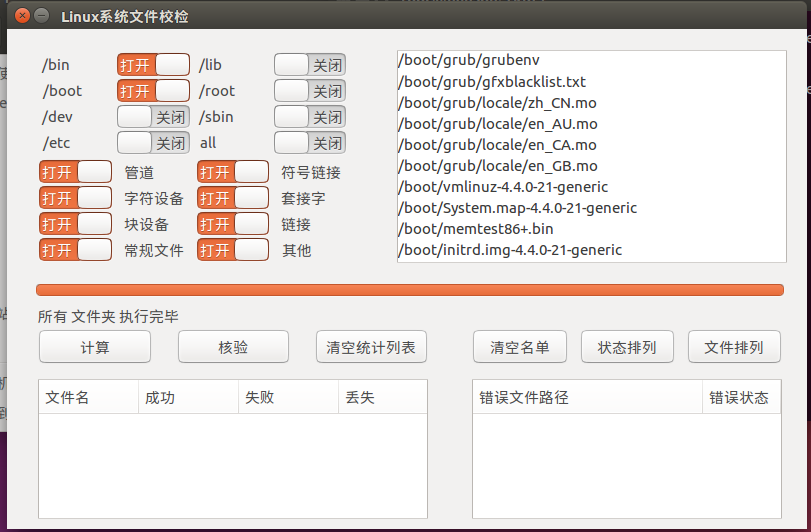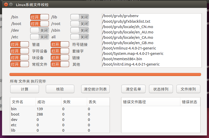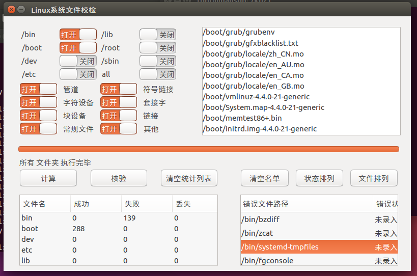除此之外,考虑到Linux系统的系统文件夹之多以及文件类型之广,软件还应该拥有一定的筛选功能,能够满足使用者在限定范围以及限定条件下的验证需求。为了方便使用者从宏观角度了解到所有文件夹中所有类型文件的完整性状况,软件还应该要有统计功能,这样使用者将能更加直观地从宏观角度了解到Linux系统的情况。