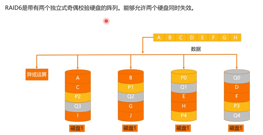 RAID6有两个独立的存放校验码的盘,至多可以两个硬盘故障