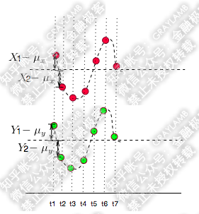 简单做了个图:分别用红点和绿点表示X、Y,横轴是时间。可以看到X,Y均围绕各自的均值运动,并且很明显是同向变化的。