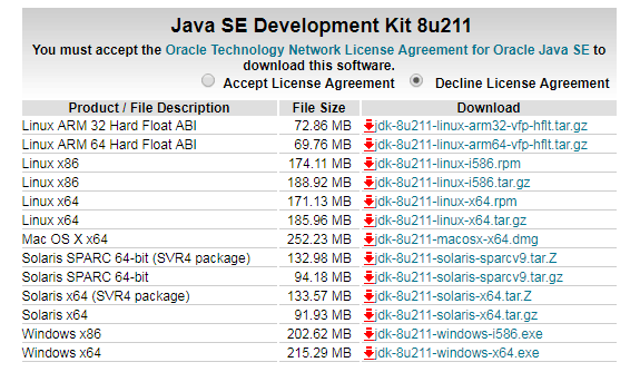 x86为32位的版本,x64为64位的版本,根据自己操作系统的版本选择合适的版本下载,我下载的是jdk-8u211-linux-x64.tar.gz