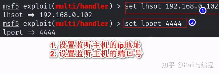 3.设置监听kali虚拟机的ip地址和端口号(与之前生成apk木马文件的命令参数相同)