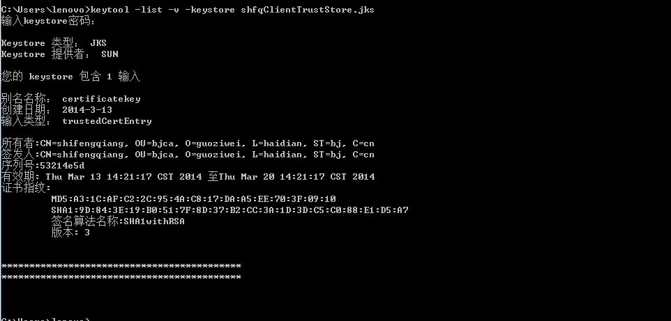 执行上面的命令会要求输入shfqkeystore的密码,会显示以下信息,如下图。
