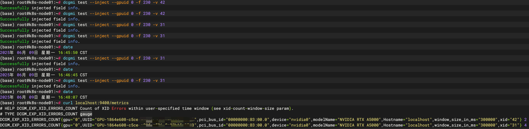 关于清空DCGM_EXP_XID_ERRORS_COUNT计数问题,我提了question,截止目前还没回复,暂时只能通过重启采集器实现计数清零。之前理解有误,DCGM_EXP_XID_ERRORS_COUNT是Gauge类型而非Counter类型,虽然它以COUNT结尾,这里明确一下他的含义,表示采集周期内各个xid错误的计数,下边是实验证明