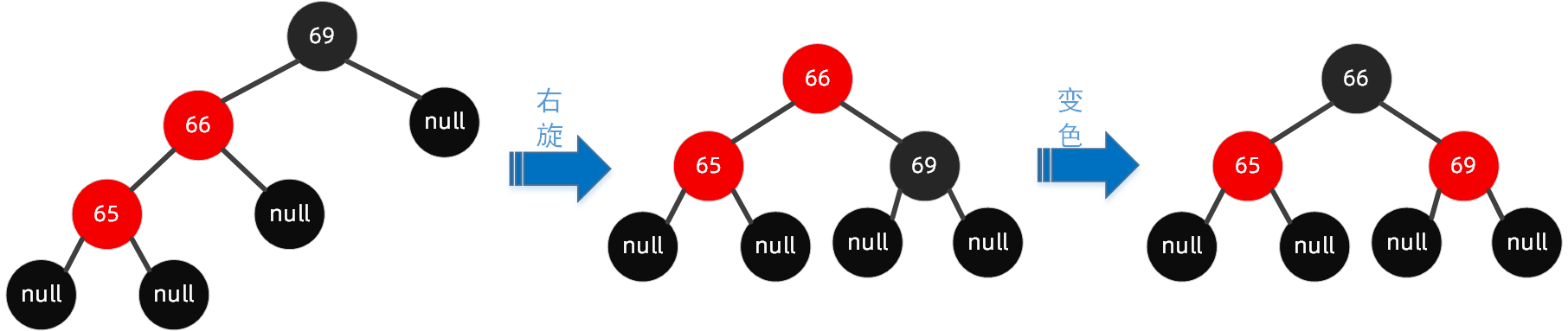 - 父右x右:右右旋转(祖父节点右旋,祖父变红,父变黑)