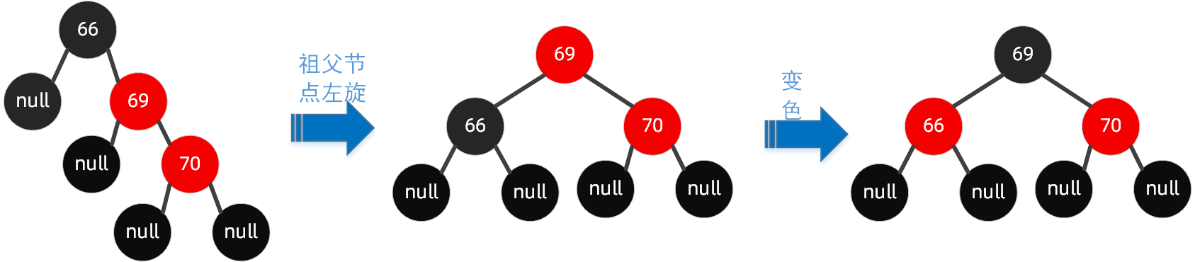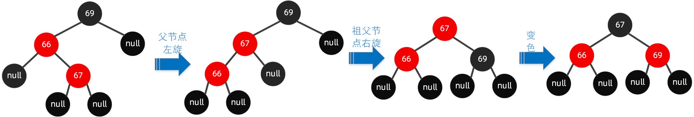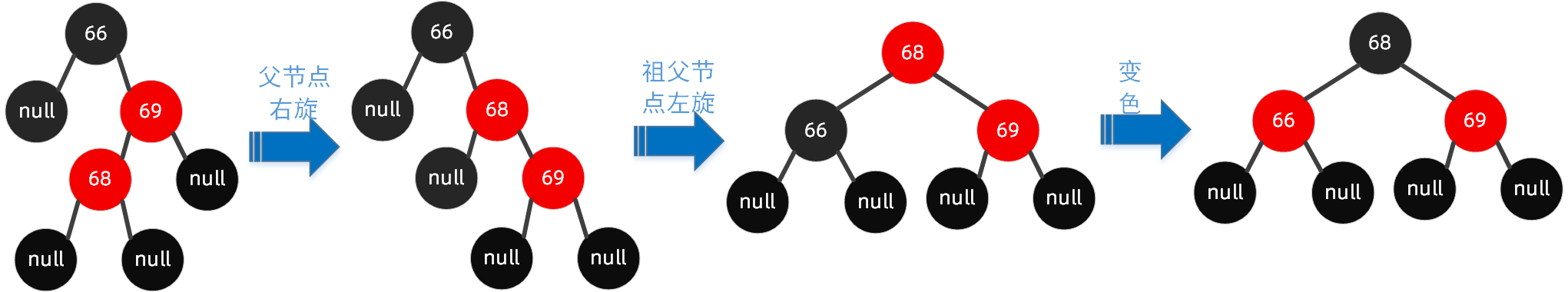 - 父右x左:右左旋转(父节点右旋,祖父节点左旋,祖父变红,x变黑)