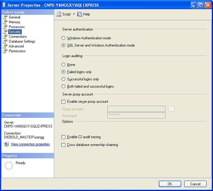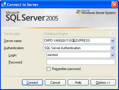 当我们启动SQL Server Management Studio Express时,首先它要连接到我们的SQL Server 2005 Express,我们在安装SQL Server 2005 Express时,默认的实例为SQLExpress,服务器名称的组成为:机器名\实例名,因此,本例的服务名称为W2K3-C\SQLEXPRESS(注:安装SQL Server 2005 Express的机器名为W2K3-C)。第一次使用SQL Server Management Studio Express,由于我们必须采用Windows身份验证,这是默认安装时决定的。 a) 设置SQL Server 2005 Express的身份验证方式