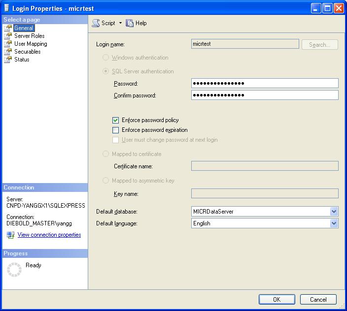 manage管理器 -> security -> 右键点击logins->new login...-> 选中sql server authentication ->设置login name 和password(confirm password)以及 默认的数据库