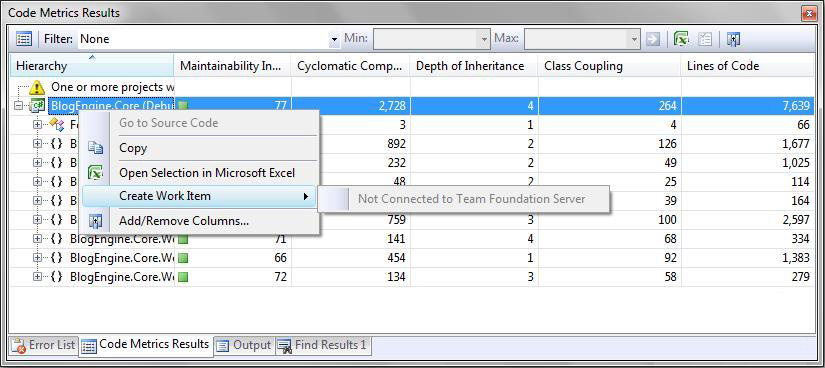 从代码度量这一点看,VSTS对于开发者在团队协作方面大大加强了,度量的结果可以直接Team Foundation无缝结合,这样开发者就可以通过Team Explorer来浏览通过代码度量创建的工作项了。在后面的代码分析中我们还会看到这一点。 代码分析