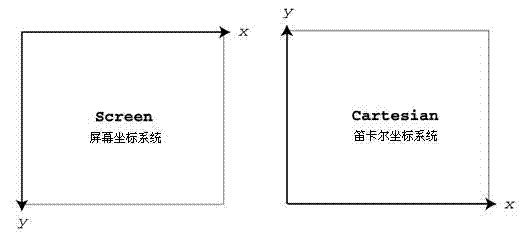 注意这里的y轴在两个坐标系统是相反的。在后面将会研究将笛卡尔坐标系统转换为屏幕坐标系统。