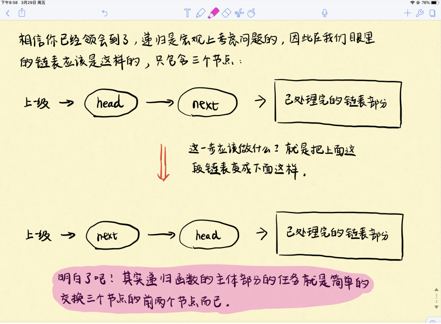 - 找终止条件。 什么情况下递归终止?没得交换的时候,递归就终止了呗。因此当链表只剩一个节点或者没有节点的时候,自然递归就终止了。