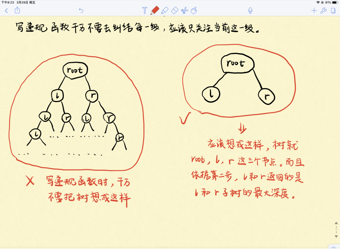 - 找返回值。 应该返回什么?题目求的是树的最大深度,我们需要从每一级得到的信息自然是当前这一级对应的树的最大深度,因此我们的返回值应该是当前树的最大深度,这一步可以结合第三步来看。