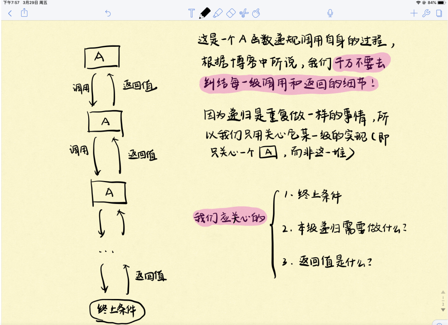 相信很多初学者和我一样,这是一个思维误区,一定要走出来。既然递归是一个反复调用自身的过程,这就说明它每一级的功能都是一样的,因此我们只需要关注一级递归的解决过程即可。