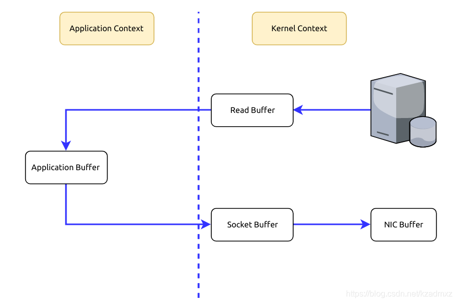 从图中可以看到,数据在内核空间和用户空间之间穿梭了两次,那么能否避免这个多余的过程呢?当然可以,Kafka使用了零拷贝技术,也就是直接将数据从内核空间的读缓冲区直接拷贝到内核空间的socket缓冲区,然后再写入到NIC缓冲区,避免了在内核空间和用户空间之间穿梭。