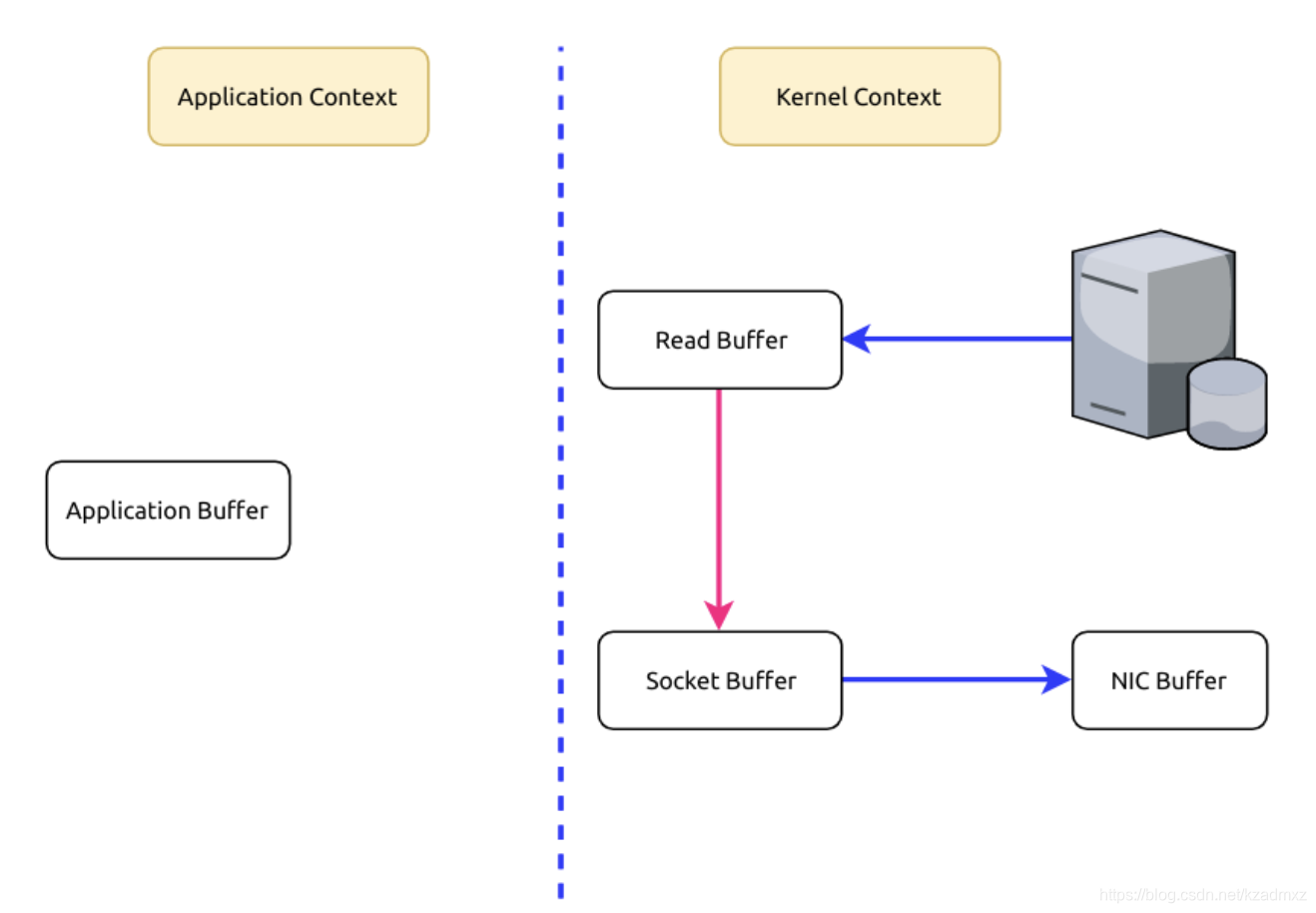 linux操作系统 “零拷贝” 机制使用了sendfile方法, 允许操作系统将数据从Page Cache 直接发送到网络,只需要最后一步的copy操作将数据复制到 NIC 缓冲区, 这样避免重新复制数据 。示意图如下: