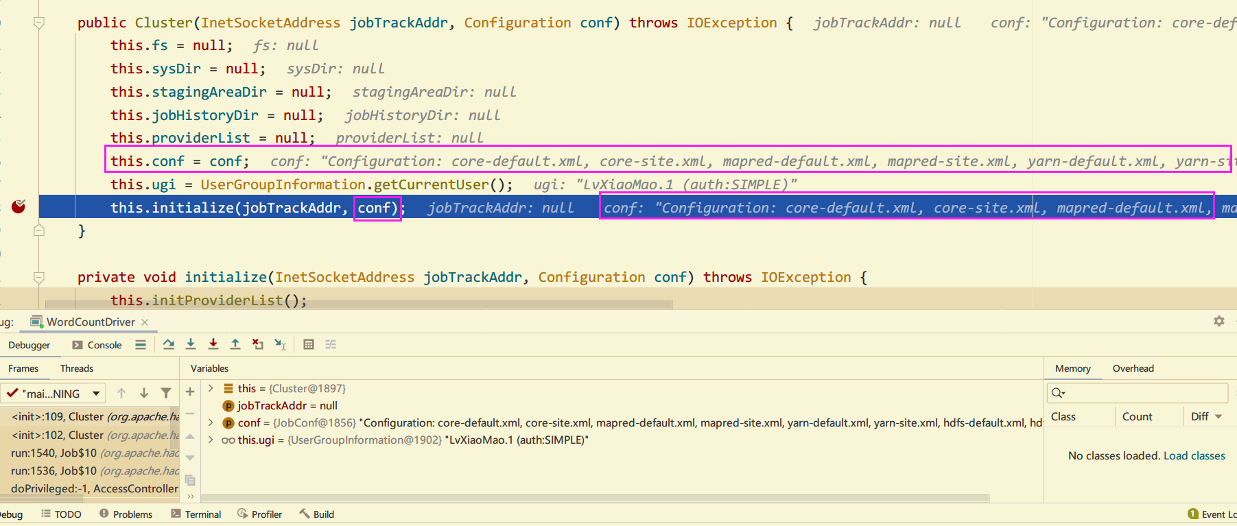 this.initialize(jobTrackAddr, conf);上再打上一个断点.