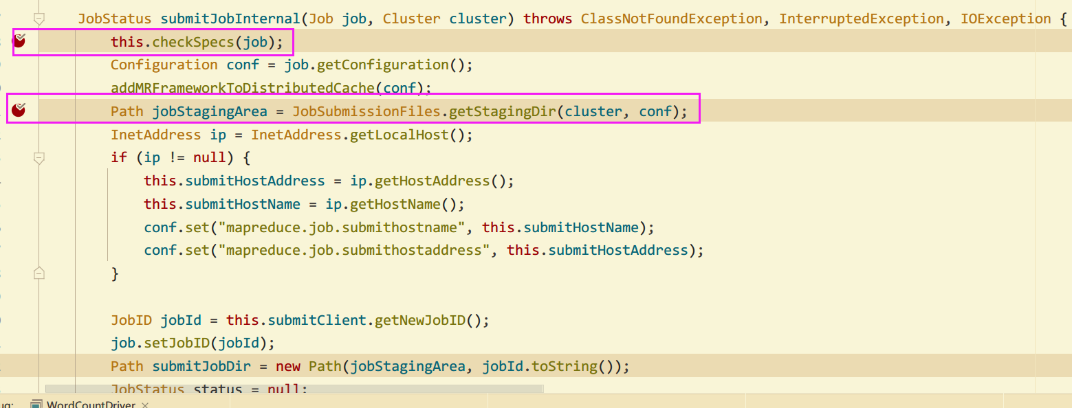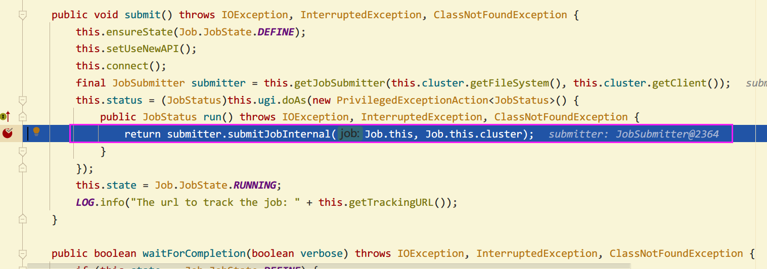 回到submit()方法内, 在submitJobInternal()上打断点, 如下图所示: