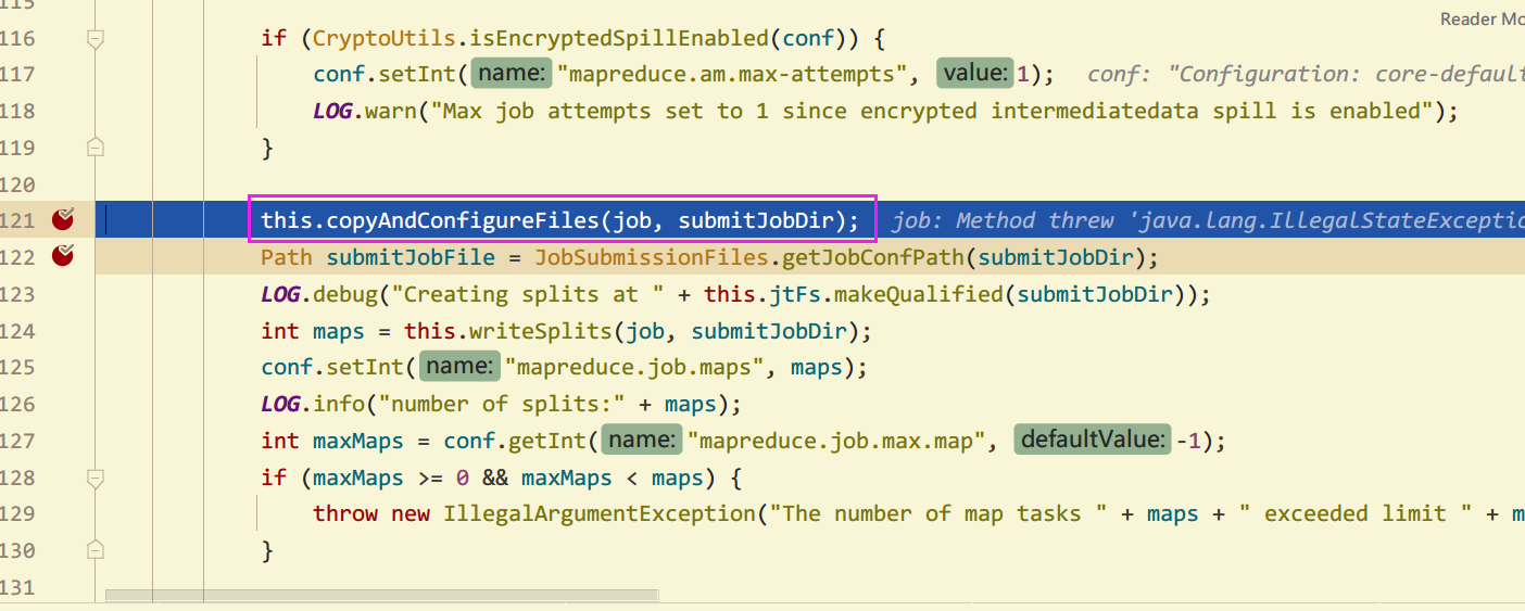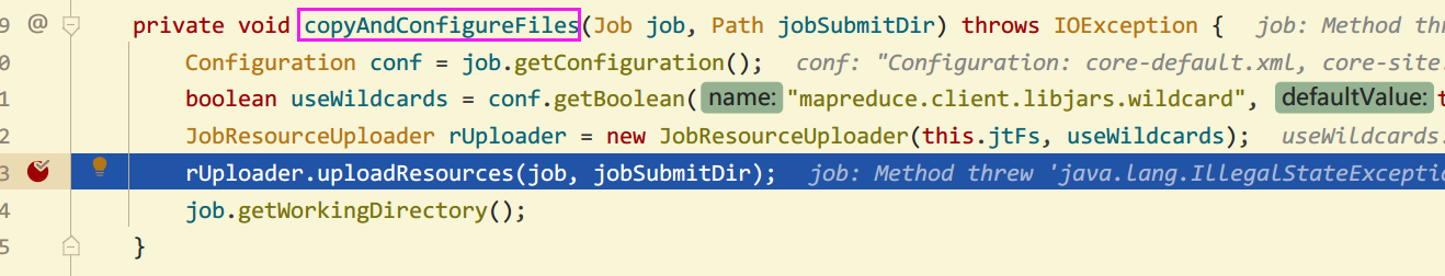 submitJobInternal()中继续往下跳过执行, 直到看到copyAndConfigureFiles,打断点如下所示: