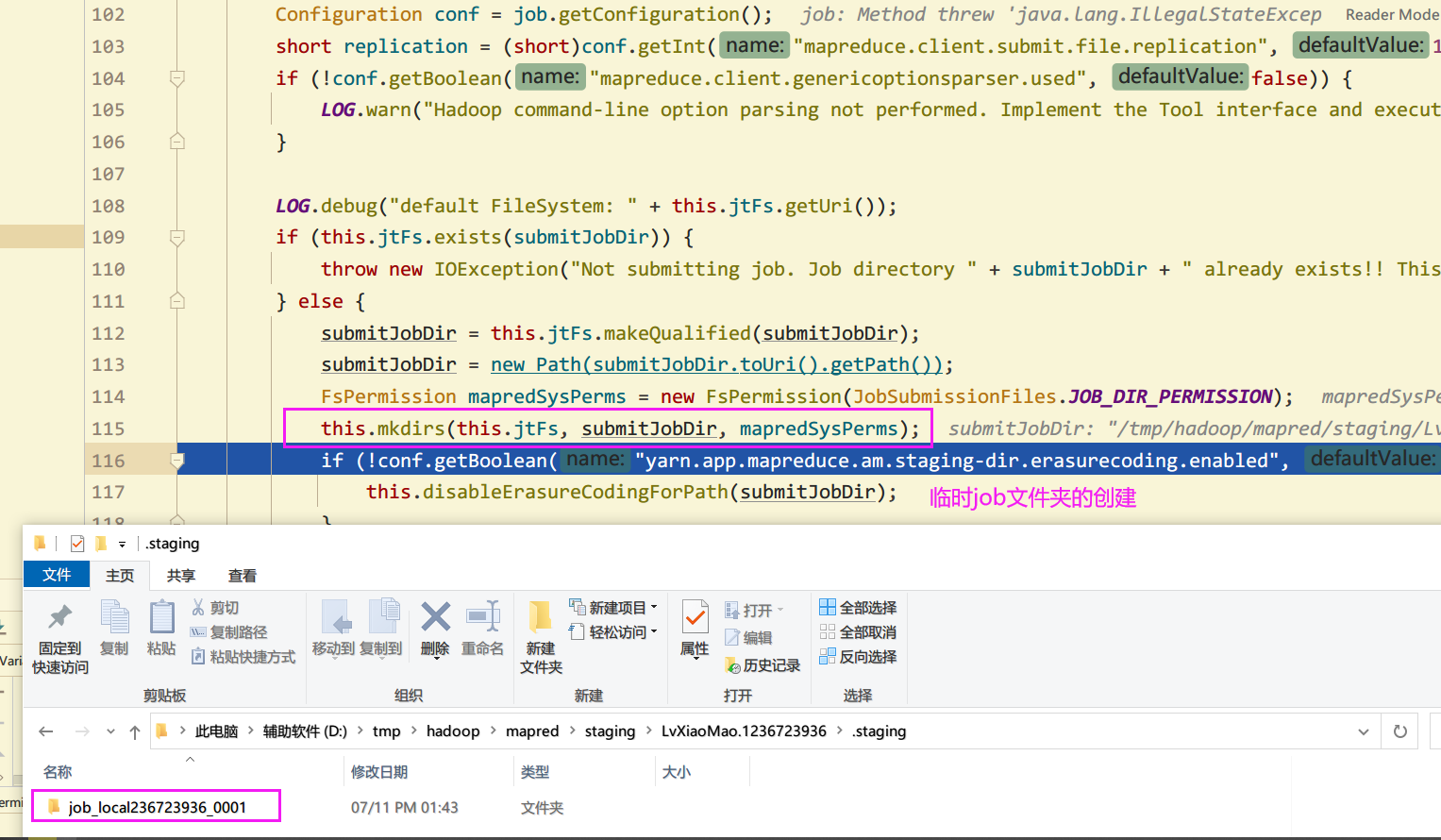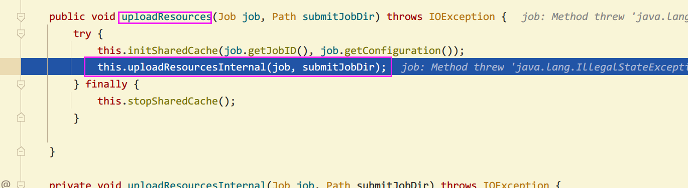 uploadResourcesInternal(Job job, Path submitJobDir)方法中完成了对job临时工作目录的创建工作. - 同时在此方法的末尾, 完成了把相关的文件提交到集群.(本地集群不会上传jar包)