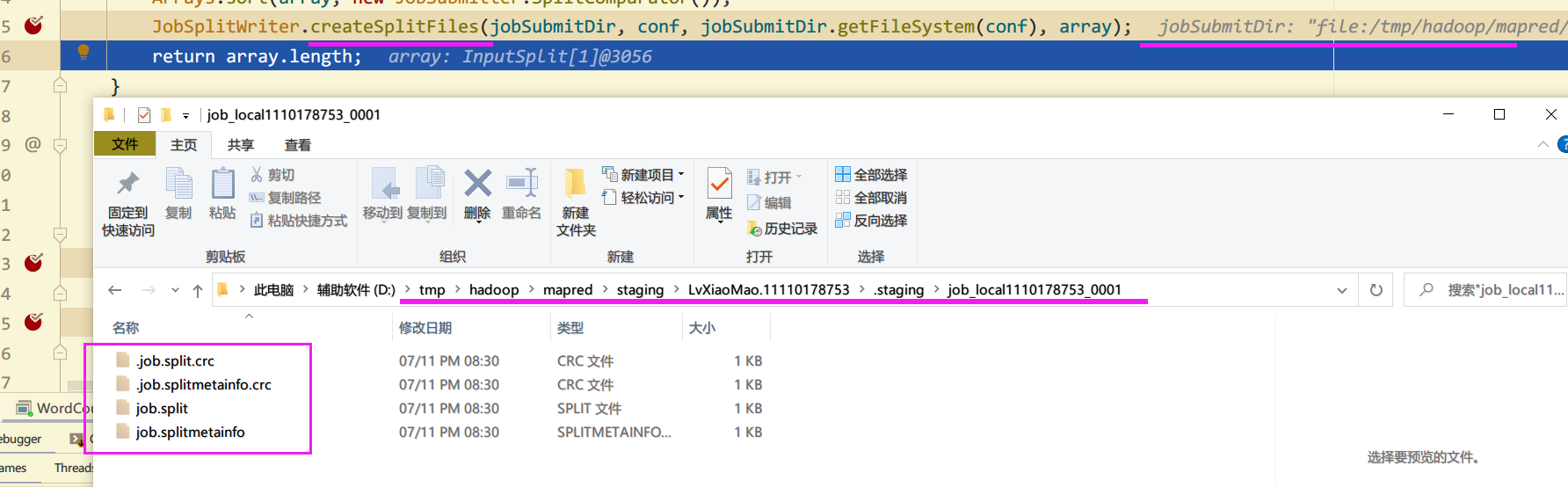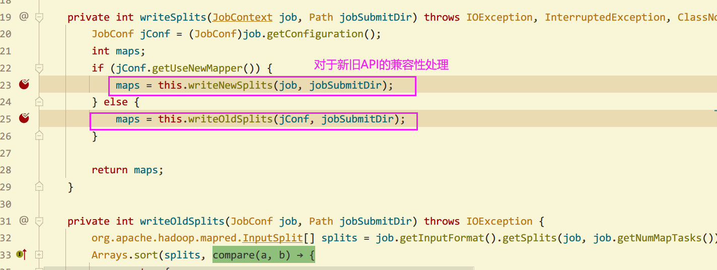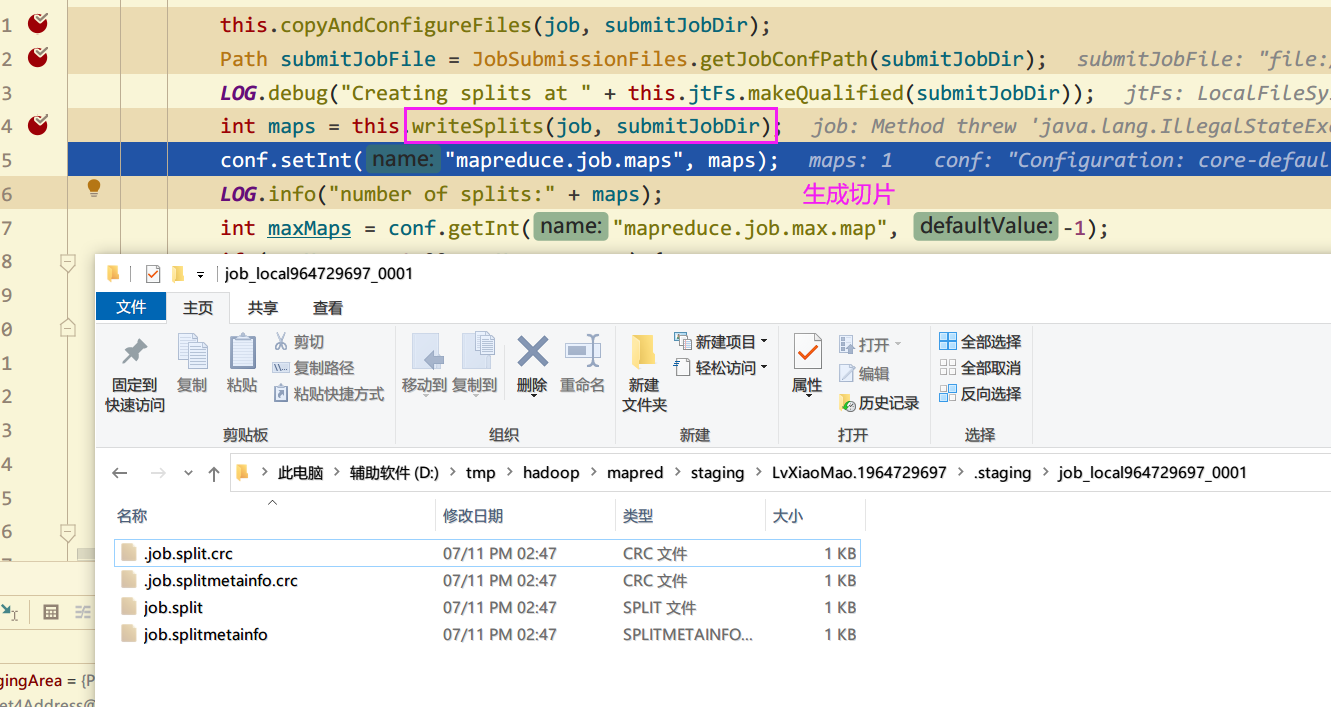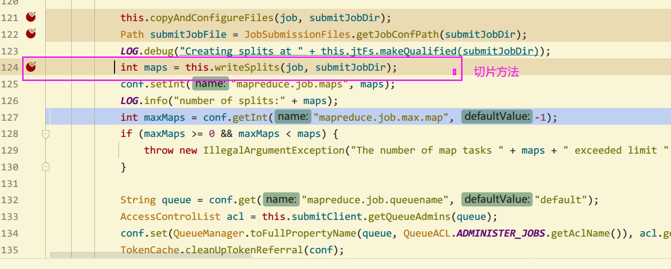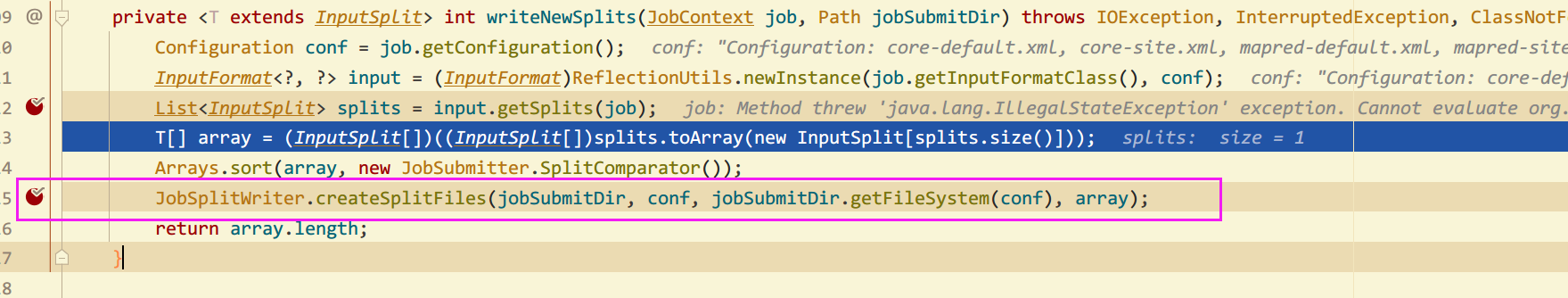 writeSplits(job, submitDir)内部, 打断点如图所示: