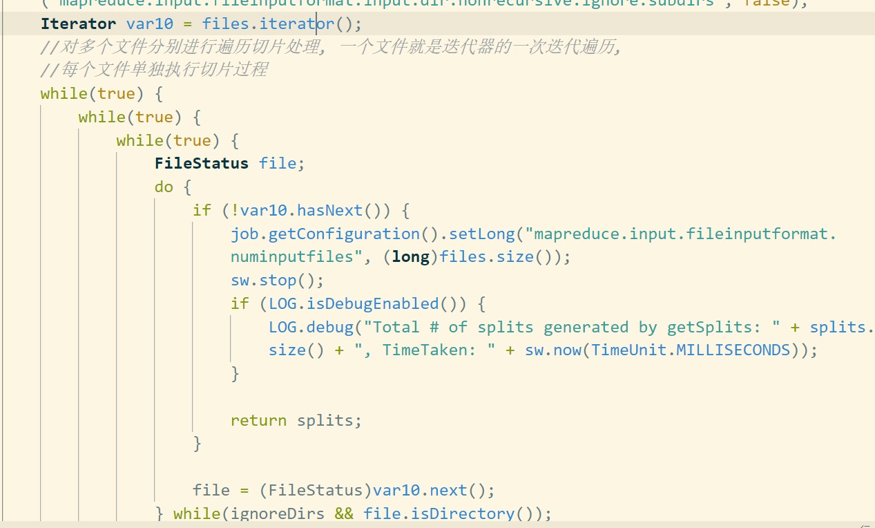writeNewSplits(job, jobSubmitDir)), 继续在getSplits()上打断点, 并进入到FileInputFormat类的getSplits()方法内部, 此方法主要是完成对各个输入文件的切片操作, 这个实现类的切片规则详见本文的末尾.