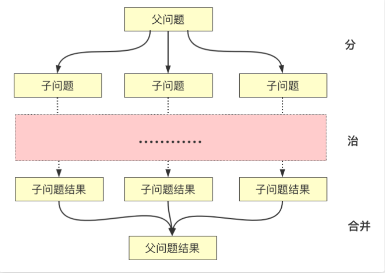 - 治(解决)(Conquer): 递归地解各子问题, 若子问题足够小, 则直接求解;