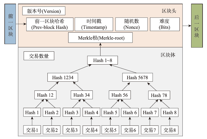 Version:比特币软件当前版本号;Pre-block Hash:区块链上前一个区块的的哈希值;Merkle - root:由当前区块中所有交易通过两两SHA256计算,最后得到的哈希值;Timestamp:当前区块生成的时间;Bits:为生成当前区块而设置的目标难度值;Nonce:工作量证明算法中用于动态改变哈希输入值的整数。
