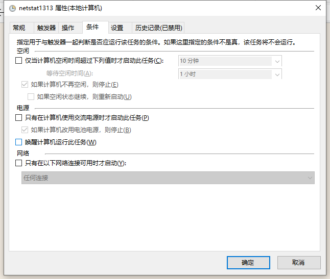- 在"条件"选项卡中可以看到,电源选项中默认操作为“只有在计算机使用交流电源时才启动此任务” ,那么使用电池电源时就会停止任务。为了我们统计足够多的数据,这个选项取消掉。