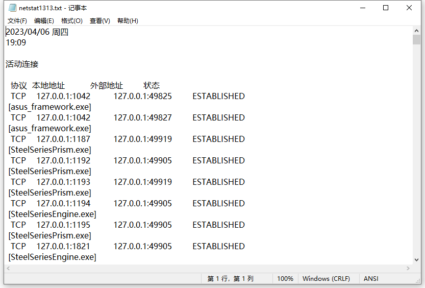 (1)使用如计划任务,每隔一分钟记录自己的电脑有哪些程序在联网,连接的外部IP是哪里。运行一段时间并分析该文件,综述分析结果。