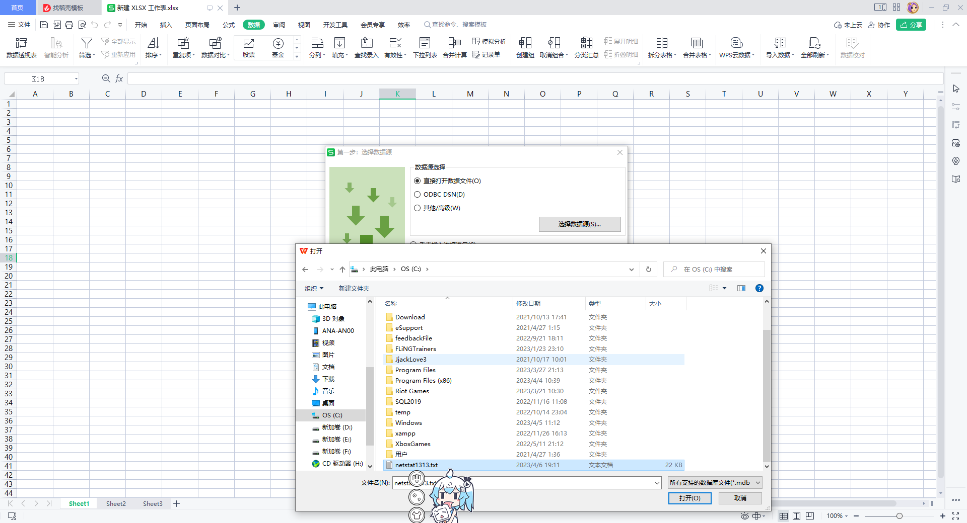 - 创建新表格,点击数据,导入数据,选择直接打开数据文件,并在选择数据源中选择文本文件。