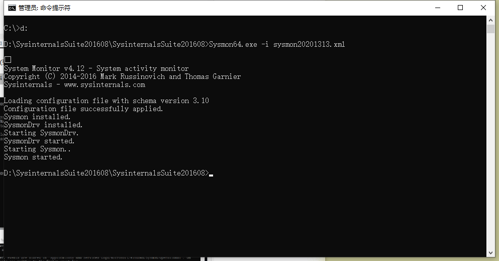 - 在cmd中进入解压后的文件夹,执行指令Sysmon.exe -i sysmon20181313.xml