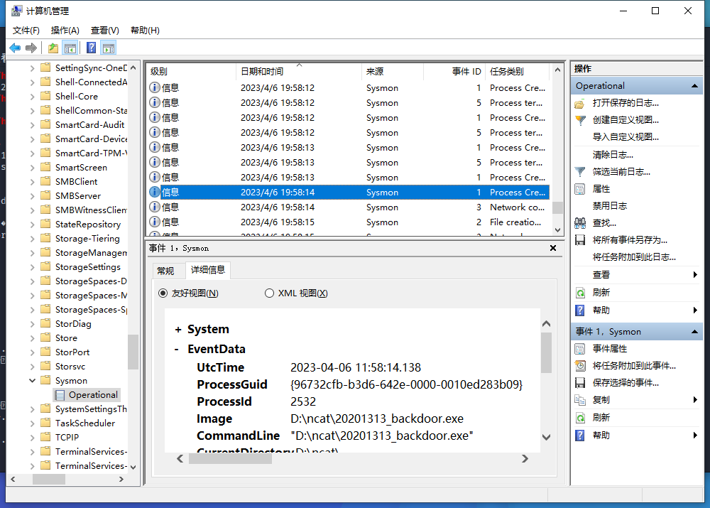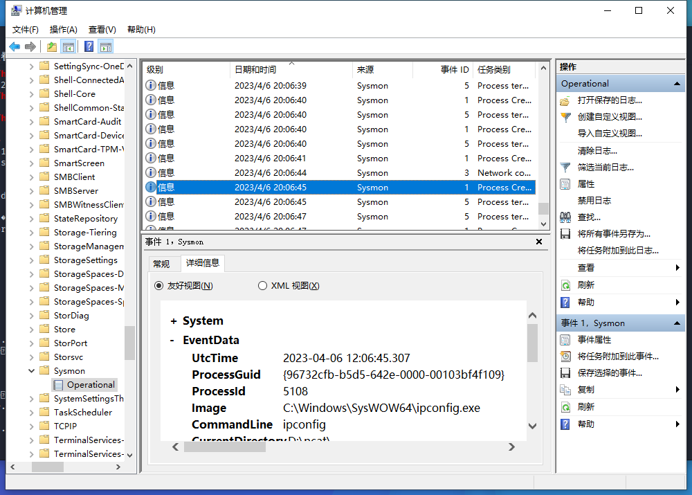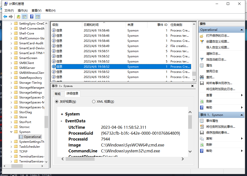 右击Win,选择事件查看器,依次选择应用程序和服务日志->Microsoft->Windows->Sysmon->Operational ,可以查看到按照配置文件中的配置信息所记录的一些信息。