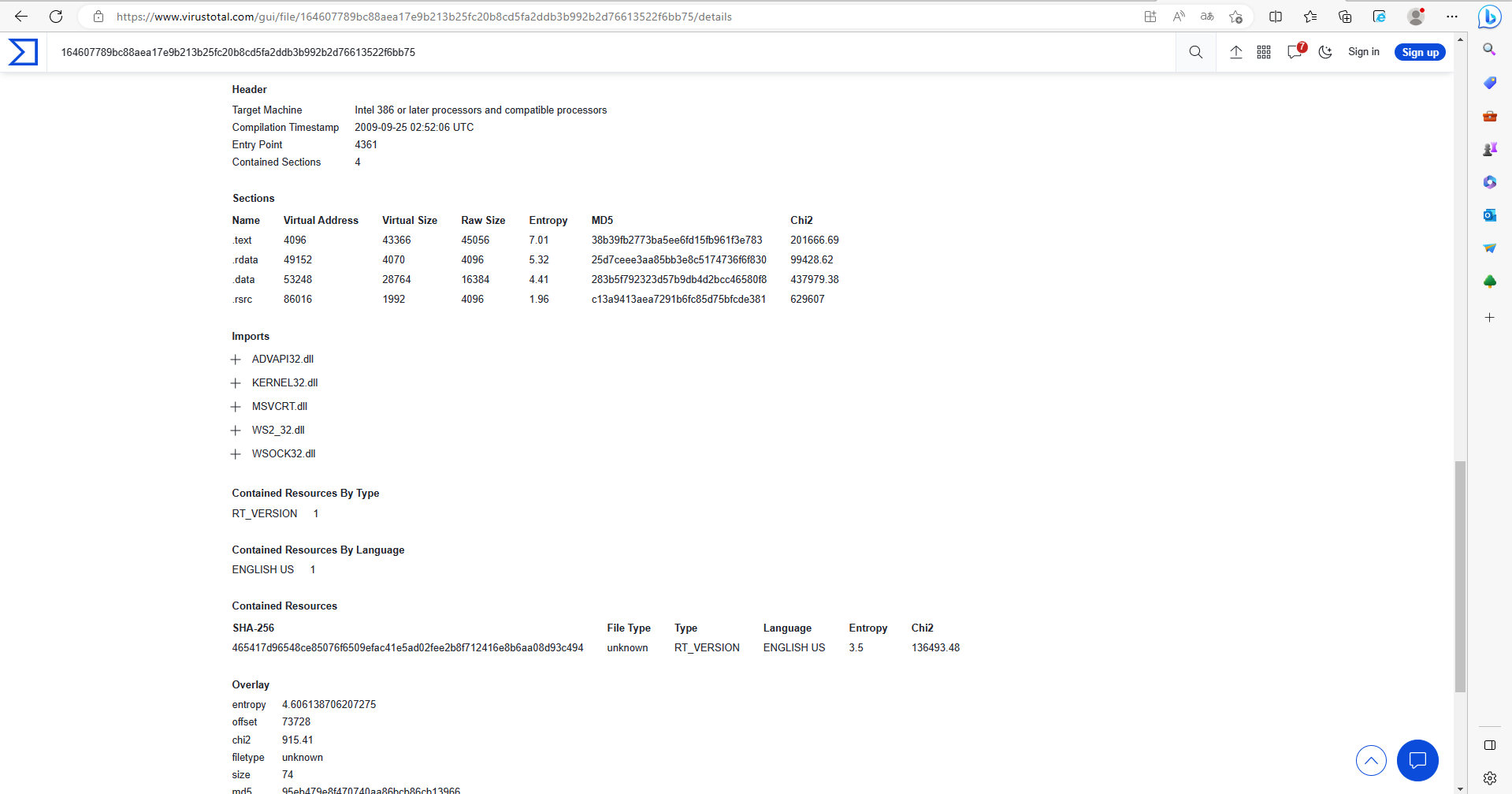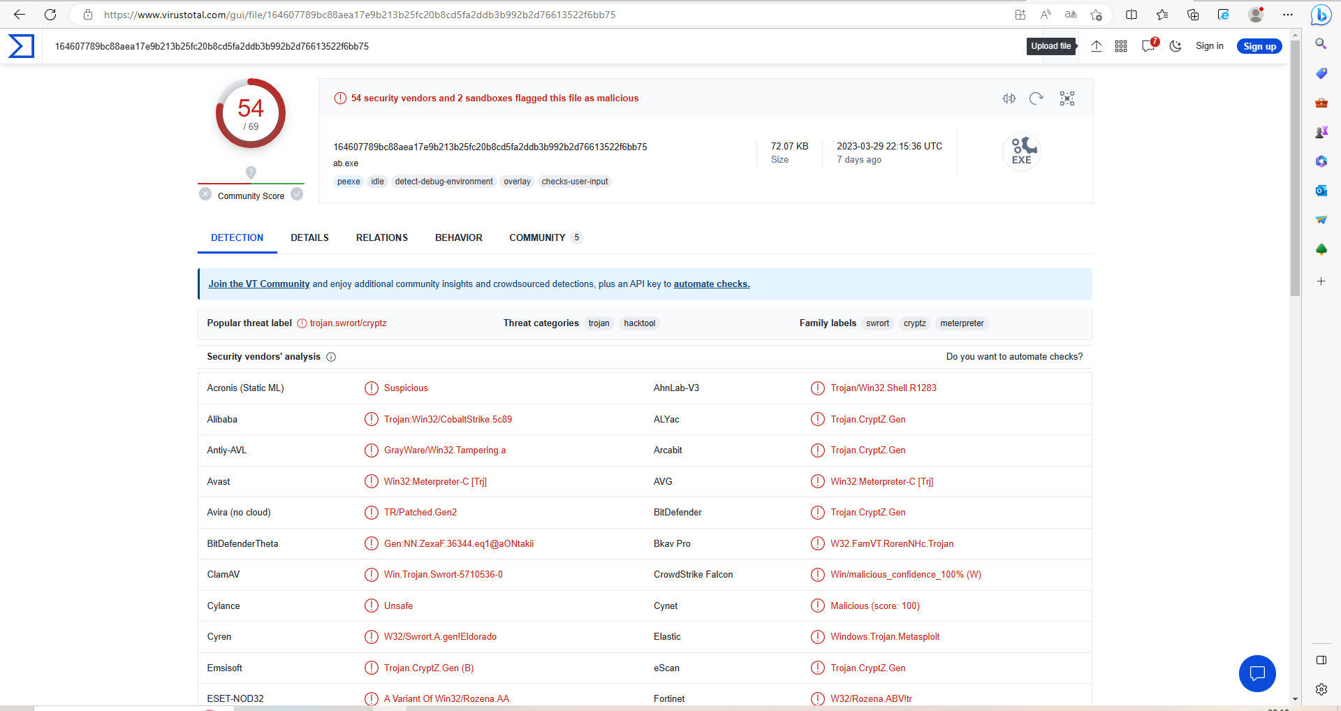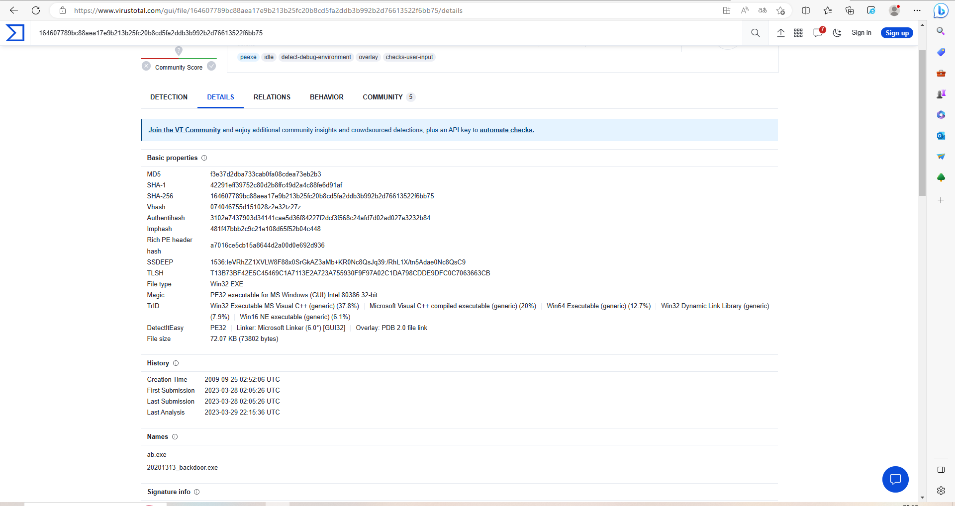 - 使用VirusTotal分析恶意代码基本信息如下: