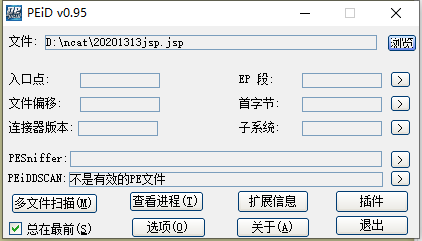 - 查看并非是.exe类型的后门程序,显示不是有效的PE文件,所以包装过的像是.apk、.jsp这类的文件是没办法通过该软件扫描的