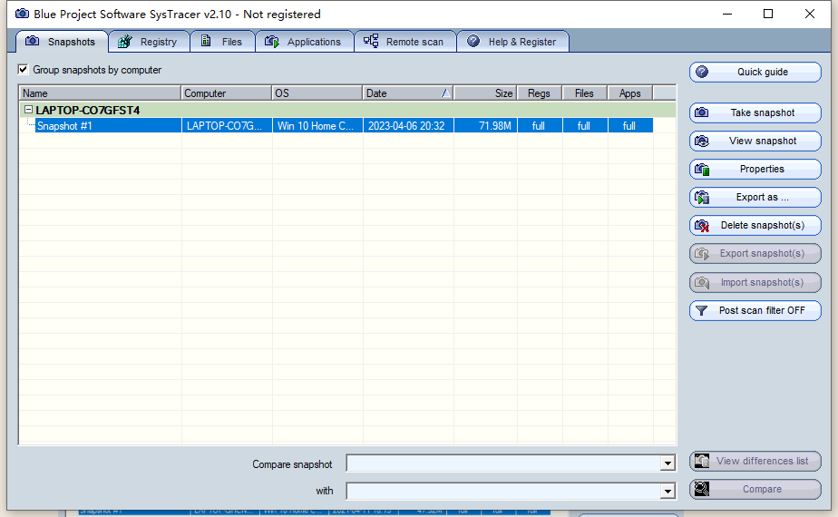 SysTracer 是一款可以分析你的计算机文件,文件夹和注册表项目改变的系统实用工具。你可以在任何想要的时间获取无数个屏幕快照。你可以比较任何一对想要的屏幕快照,并且观察其间的不同之处。获取屏幕快照通常会持续几分钟的时间,这取决于文件和文件夹的数量和注册表项目的总数。该软件特别推出一个非常高效的分析算法,比较两张屏幕快照可以瞬间完成。