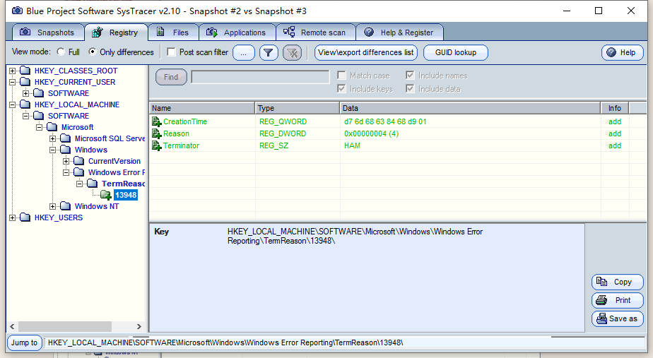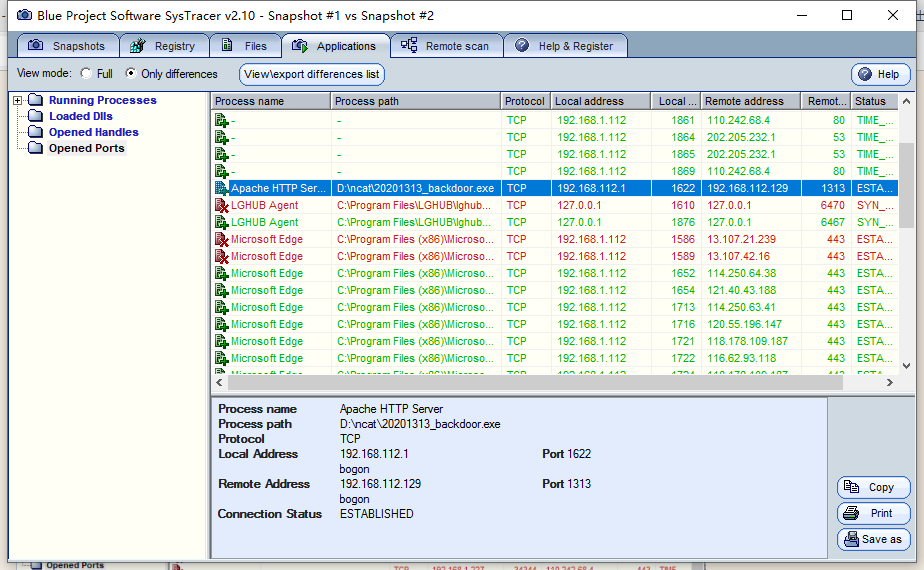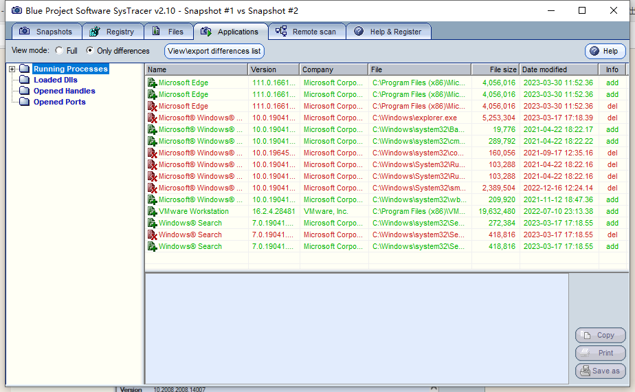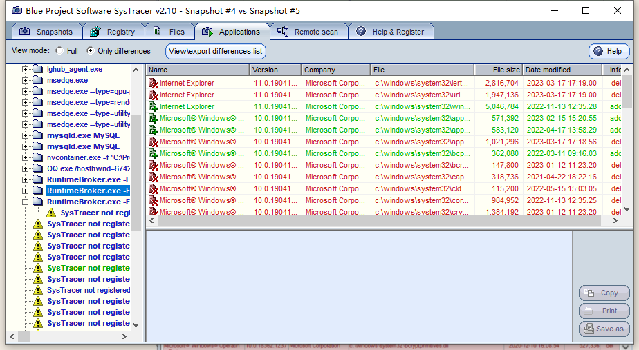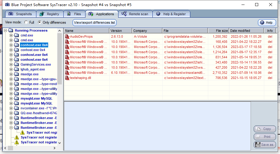 - 重启电脑,使用Systracer拍摄快照,然后打开平时常用软件,分别拍摄不同快照,对比不同快照,查看是否有可疑的增删注册表、启动项的行为,然后分析哪个软件最可能被那些进程盯上。