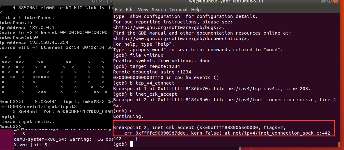 然后在MenuOS中输入replyhi,结果断在了inet_csk_accept函数