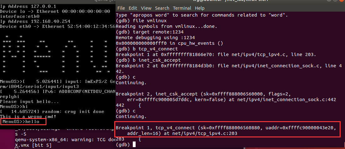 接着在MenuOS中输入hello,结果断在了tcp_v4_connect函数。