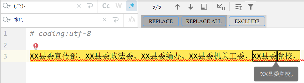 在pycharm使用 Ctrl + R 调出正则表达式的使用页面,编辑好之后使用replaceall替换全部,