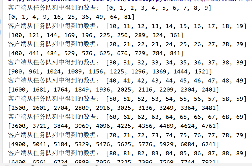 计算 1-200 的平方,数据长这样:[[0, 1, 2, 3, 4, 5, 6, 7, 8, 9], [10, 11, 12, 13, 14, 15, 16, 17, 18, 19],...,[180, 181, 182, 183, 184, 185, 186, 187, 188, 189],[190, 191, 192, 193, 194, 195, 196, 197, 198, 199]],长度为20 ,每个客户端处理10长度的数据