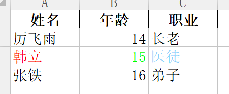 【按行】将姓名为“韩立“,的年龄、职业分别标红、标绿、标蓝