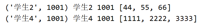 dict2 = {("学生2",1001):[44,55,66],("学生4",1001):[1111,2222,3333]}