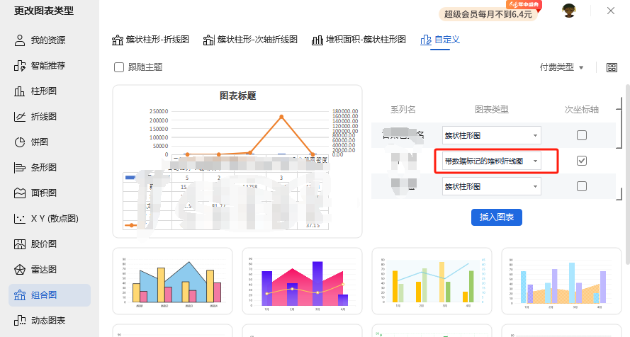 右键图表,选择“更改系列图表类型”,在图表系列设置界面,把需要的系列,图表类型修改为“带平滑线和数据标记的散点图”,