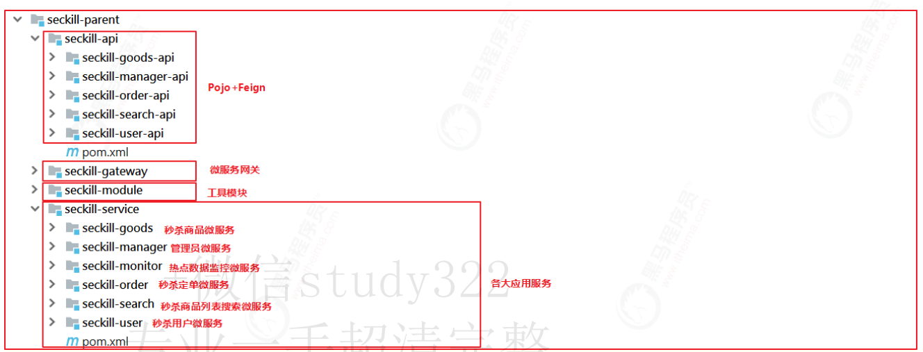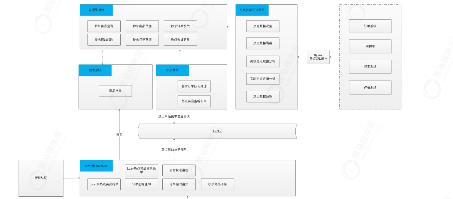 当前秒杀系统中一共涉及到管理员后台、搜索系统、秒杀系统、抢单流程系统、热点数据发现系统,如