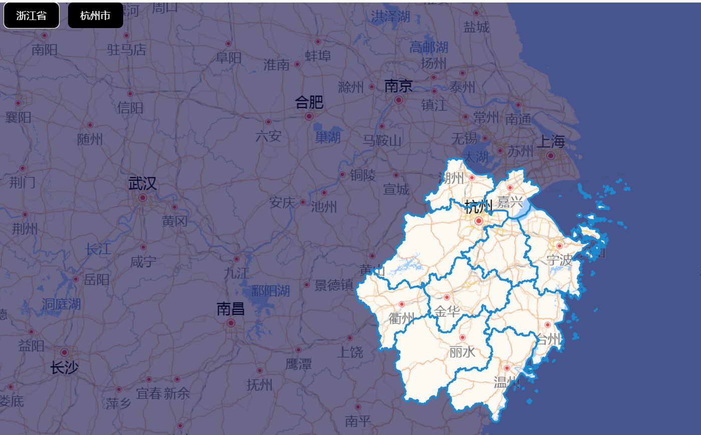 效果图如下:点击浙江省展示浙江省高亮,点击杭州市展示杭州市高亮