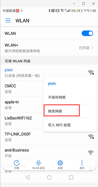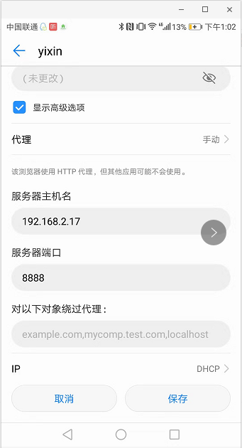 在 设置 -WLAN-长按局域网---点击修改网络-勾选显示高级选项,配置服务器主机名为上一个IP,端口号为8888,之后点击保存。