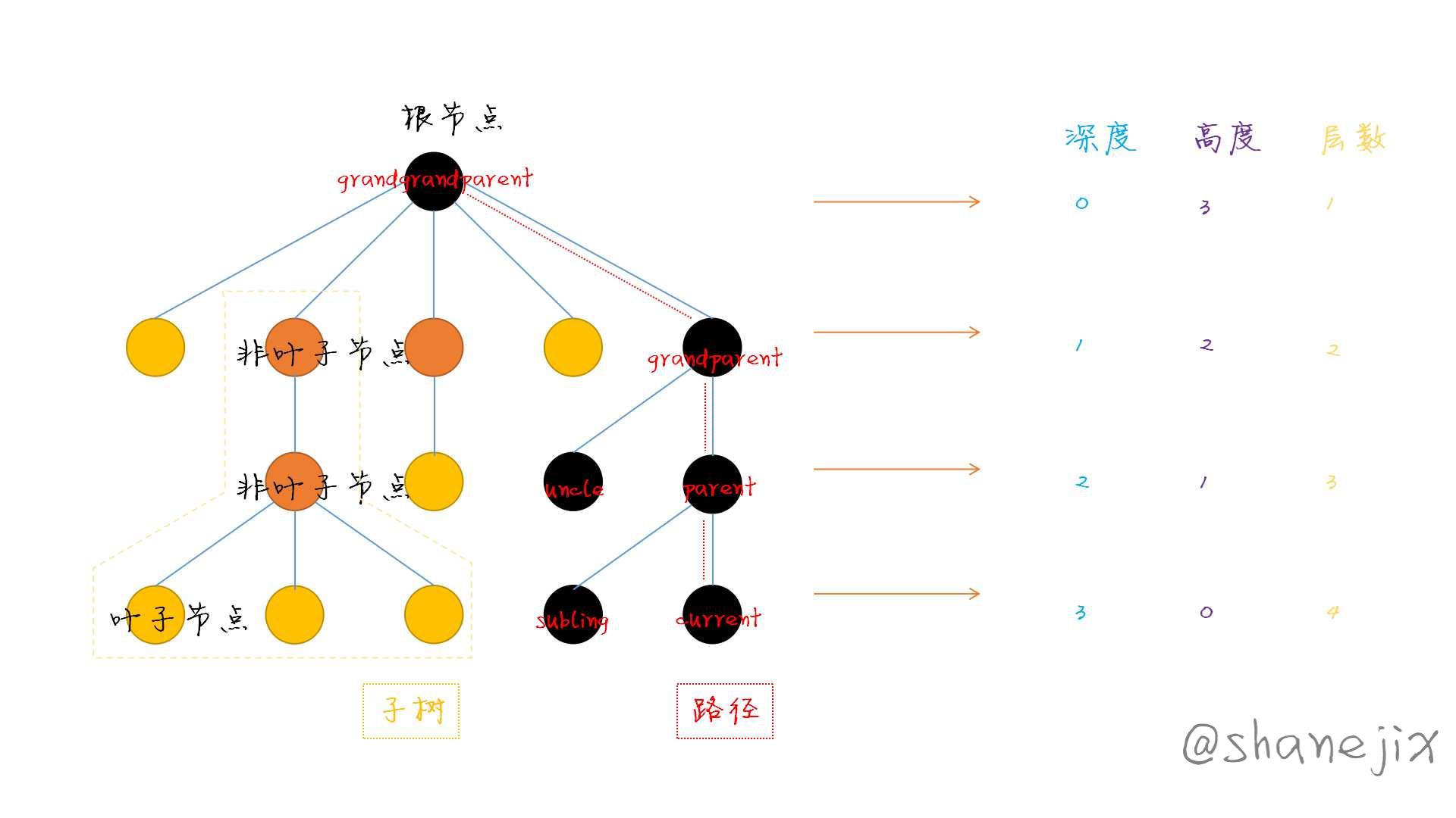 深度,高度,层数:这三个概念比较容易混淆,放在一起类比。深度,类比于树根从地表向下衍生的深度。高度,类比于楼房的地表绝对高度或者山峰的海拔高度。可能你也发现了,首先有一个参考标准,相对于谁的高度或深度。所以一般会计算整棵树的高度(深度),或者某个节点的高度(深度)。然后,就是计数的规则,一般情况,高度,深度都是从 0 开始计数,层次从 1 开始计数。但是,也有从层次从 0 计数,高度,深度从 1 计数的时候。