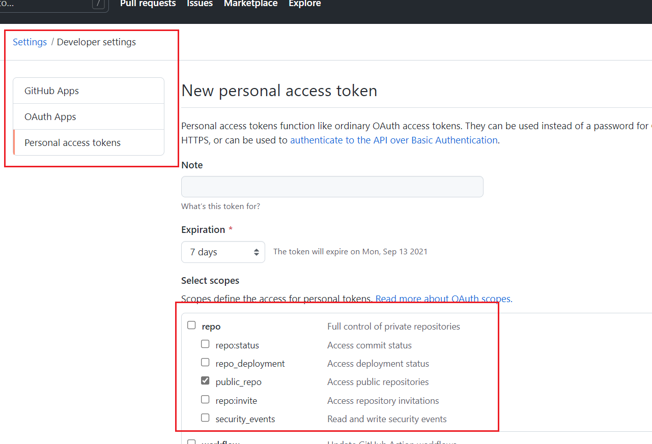 生成个人账号分配的 github api 权限列表的 token 待用。这里只生成了对开源仓库的操作权限