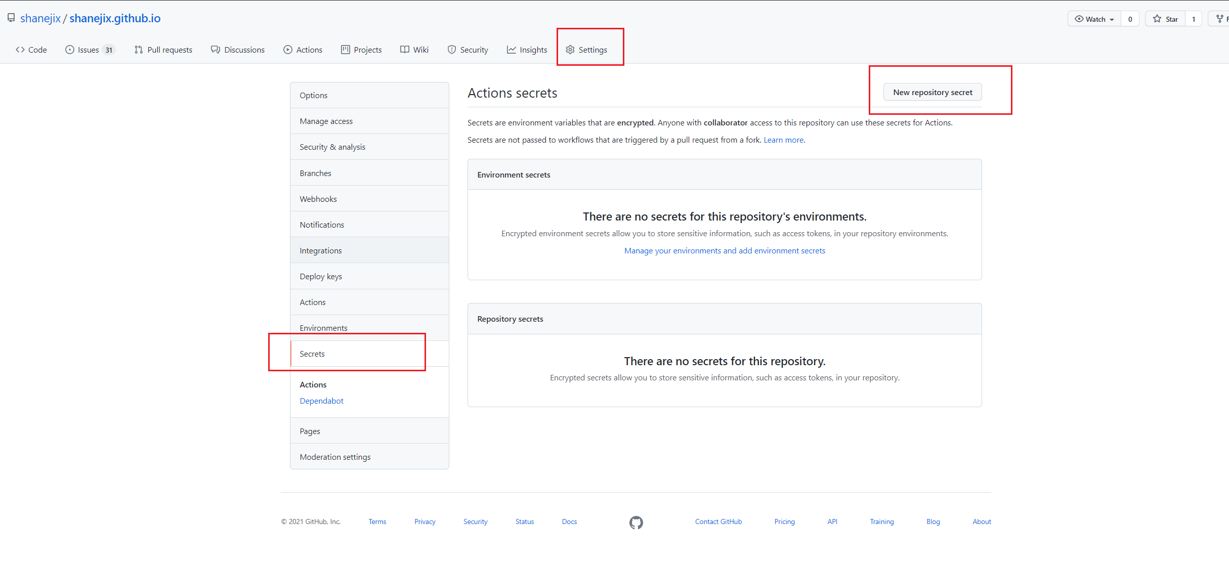 - 在 xx.github.io 的 secret 中填入 acess token name 对应 secret name 待用,value 对应 access token